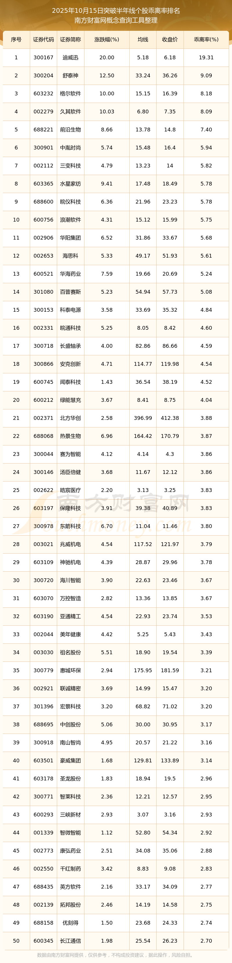 2025年10月15日突破120日线个股乖离率排名