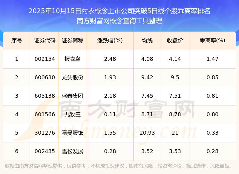 2025年10月15日衬衣概念上市公司突破5日线个股乖离率排名