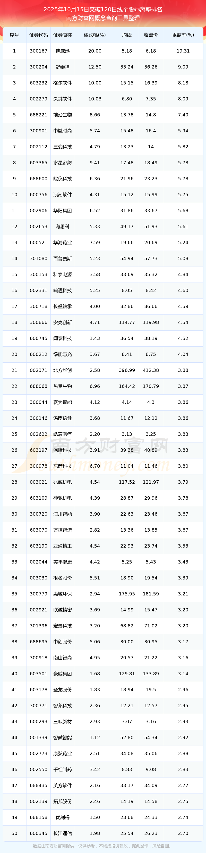 根据南方财富网概念查询工具数据统计,截止2025年10月15日收盘,共有349只个股收盘价向上突破了120日线,其中乖离率较大的个股有迪威迅、舒泰神、格尔软件、久其软件、前沿生物等,乖离率分别为19.31%、9.09%、8.18%、8.09%、7.40%。