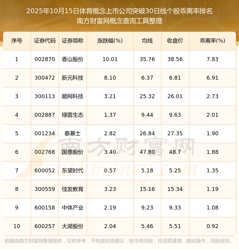 2025年10月15日体育概念上市公司突破30日线个股乖离率排名
