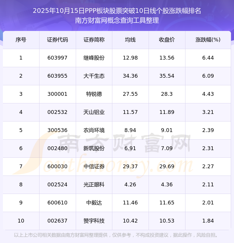 根据南方财富网概念查询工具数据统计,截止2025年10月15日收盘,PPP板块股票共有39只个股收盘价向上突破了10日线。其中涨幅较大的个股有继峰股份、大千生态、特锐德等,涨幅分别为6.44%、6.09%、4.43%。