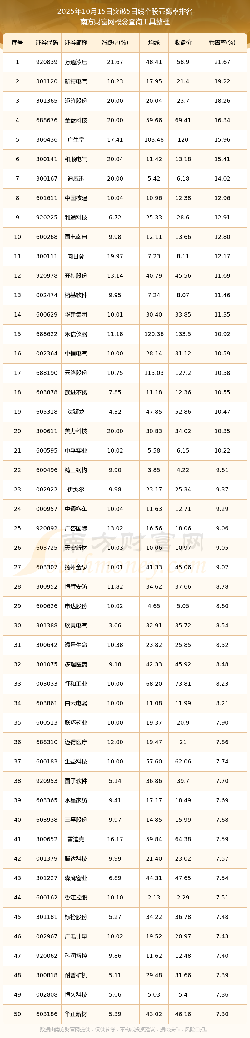 根据南方财富网概念查询工具数据统计,截止2025年10月15日收盘,共有1930只个股收盘价向上突破了5日线,其中乖离率较大的个股有万通液压、新特电气、矩阵股份、金盘科技、广生堂等,乖离率分别为21.67%、19.22%、18.26%、16.34%、15.96%。