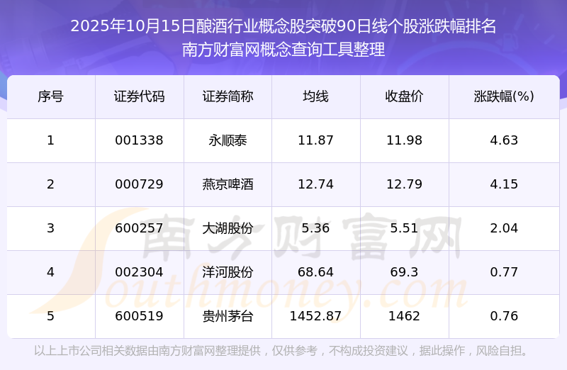 根据南方财富网概念查询工具数据统计,截止2025年10月15日收盘,酿酒行业概念股共有5只个股收盘价向上突破了90日线。其中涨幅较大的个股有永顺泰、燕京啤酒、大湖股份等,涨幅分别为4.63%、4.15%、2.04%。