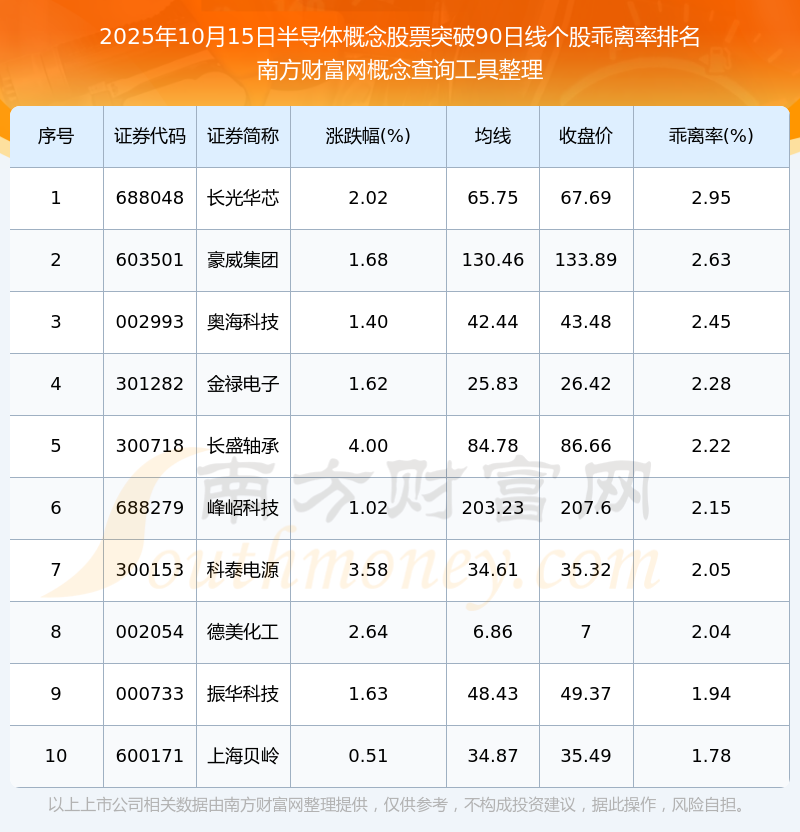 根据南方财富网概念查询工具数据统计,截止2025年10月15日收盘,半导体概念股票共有24只个股收盘价向上突破了90日线。其中乖离率较大的个股有长光华芯、豪威集团、奥海科技等,乖离率分别为2.95%、2.63%、2.45%。