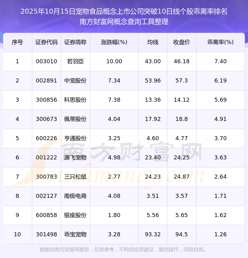 2025年10月15日宠物食品概念上市公司突破10日线个股乖离率排名