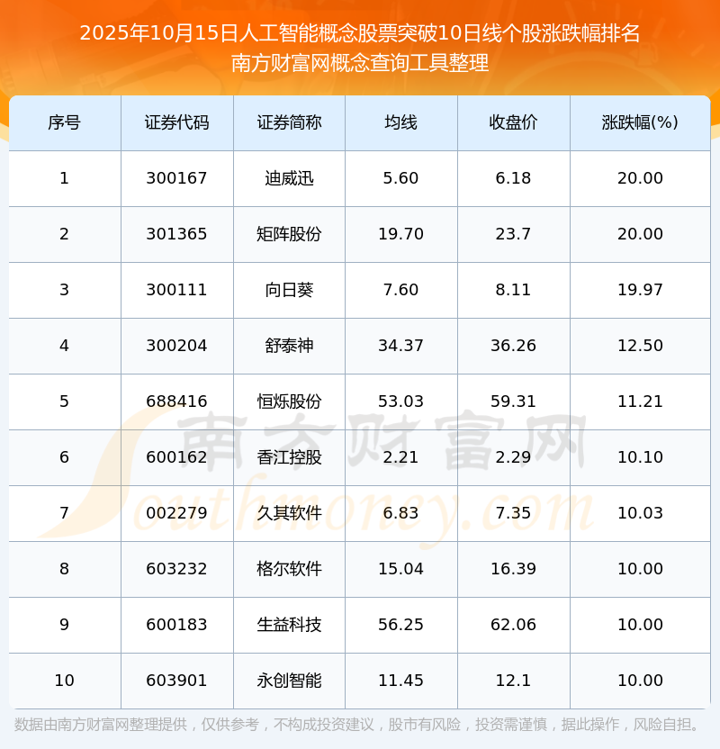 2025年10月15日人工智能概念股票突破10日线个股涨跌幅排名