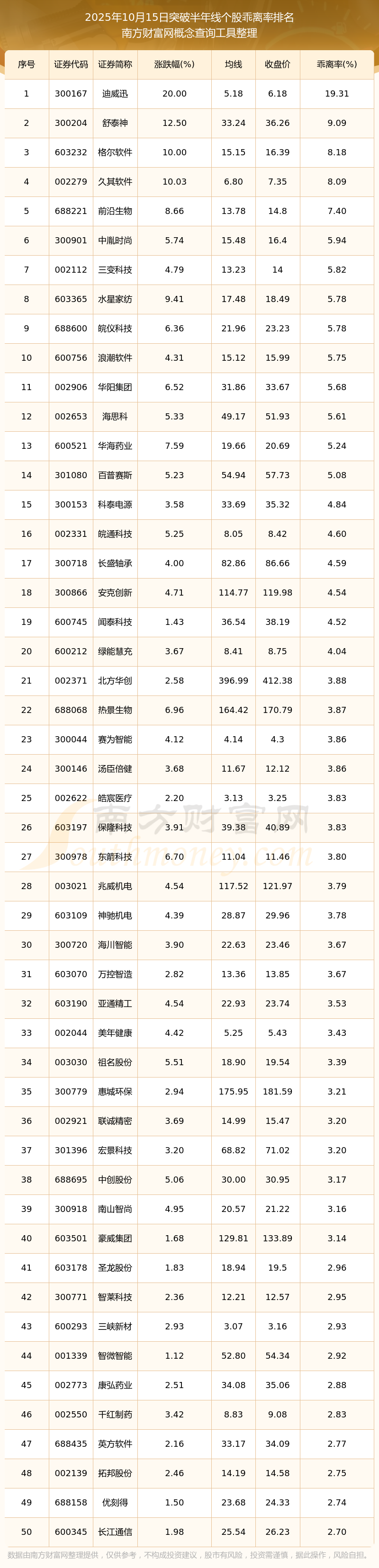 2025年10月15日突破半年线个股乖离率排名