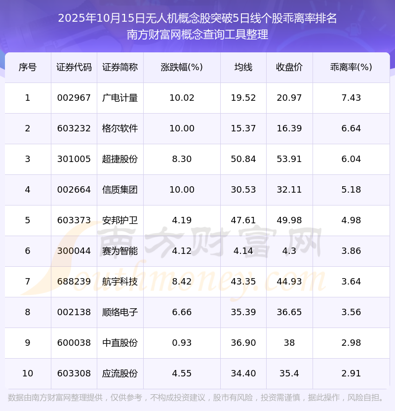 根据南方财富网概念查询工具数据统计,截止2025年10月15日收盘,无人机概念股共有70只个股收盘价向上突破了5日线。其中乖离率较大的个股有广电计量、格尔软件、超捷股份等,乖离率分别为7.43%、6.64%、6.04%。