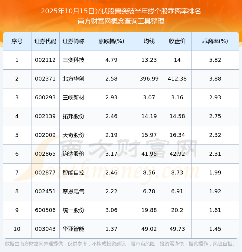 根据南方财富网概念查询工具数据统计,截止2025年10月15日收盘,光伏股票共有26只个股收盘价向上突破了半年线。其中乖离率较大的个股有三变科技、北方华创、三峡新材等,乖离率分别为5.82%、3.88%、2.93%。