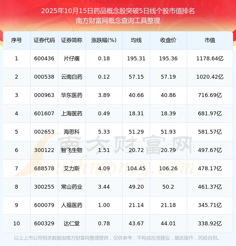 根据南方财富网概念查询工具数据统计,截止2025年10月15日收盘,药品概念股共有176只个股收盘价向上突破了5日线。其中市值较大的个股有片仔癀、云南白药、华东医药等,市值分别为1178.64亿、1020.42亿、716.69亿。