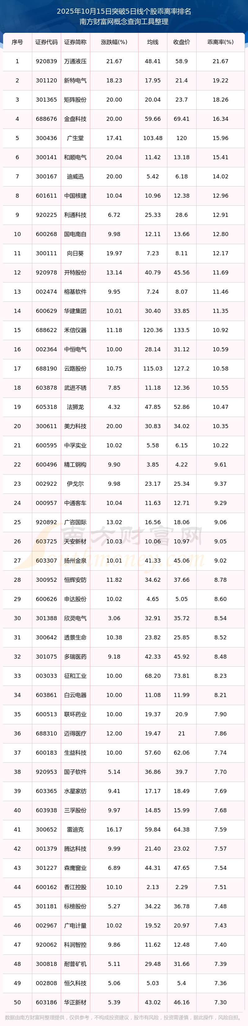 根据南方财富网概念查询工具数据统计,截止2025年10月15日收盘,共有1930只个股收盘价向上突破了5日线,其中乖离率较大的个股有万通液压、新特电气、矩阵股份、金盘科技、广生堂等,乖离率分别为21.67%、19.22%、18.26%、16.34%、15.96%。