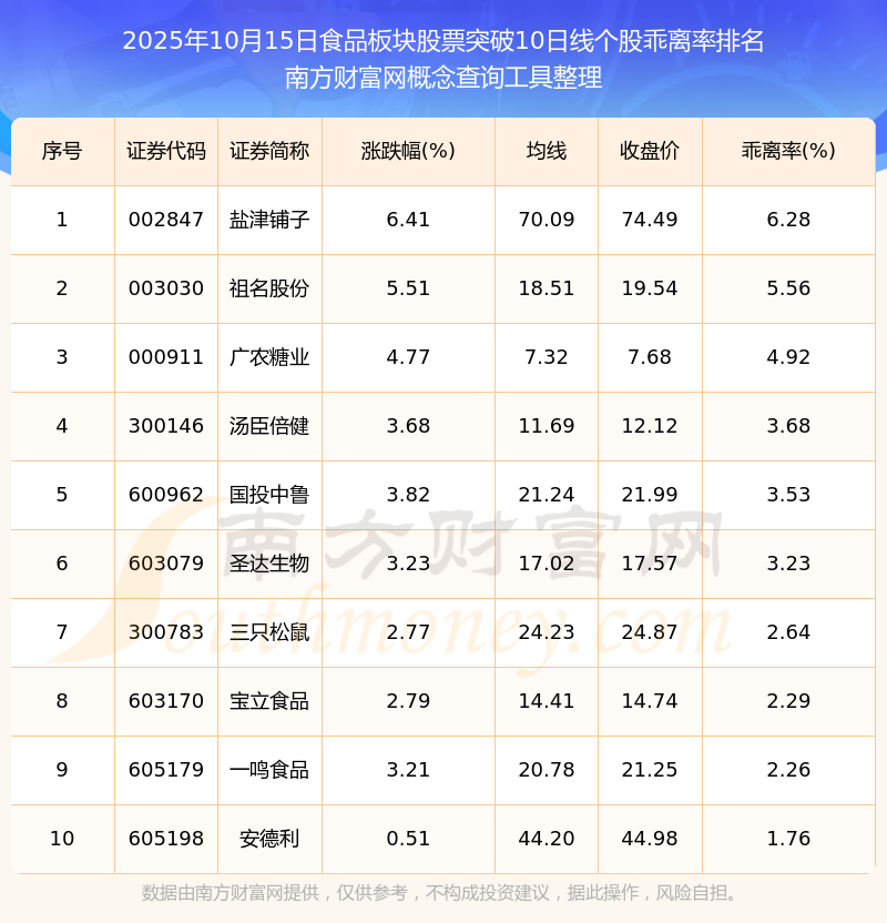 2025年10月15日食品板块股票突破10日线个股乖离率排名