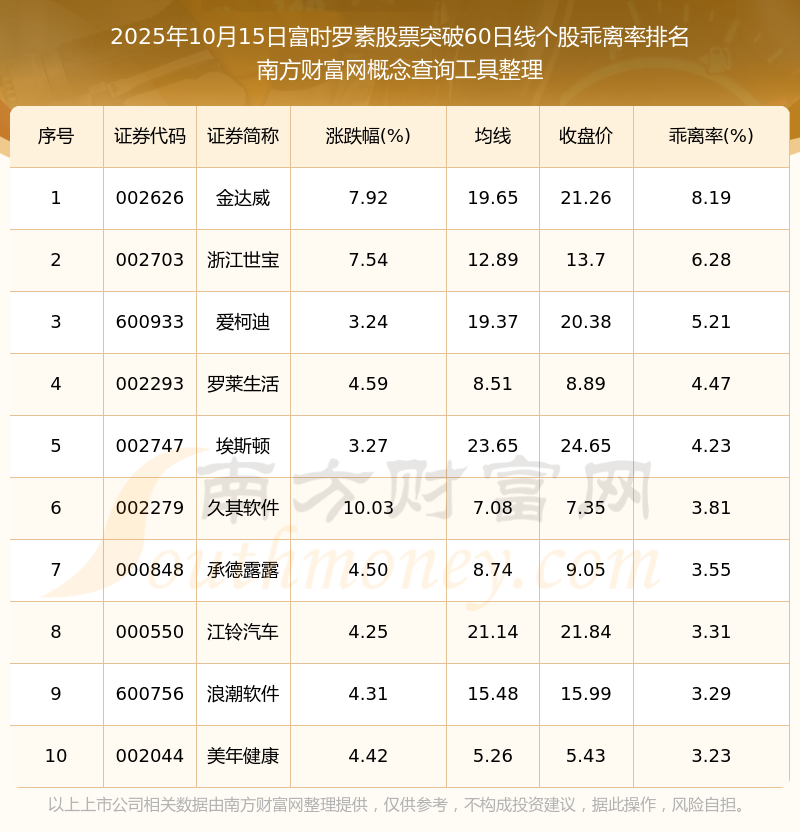 2025年10月15日富时罗素股票突破60日线个股乖离率排名