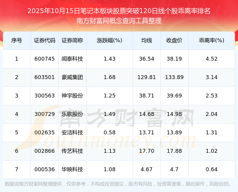 2025年10月15日笔记本板块股票突破120日线个股乖离率排名