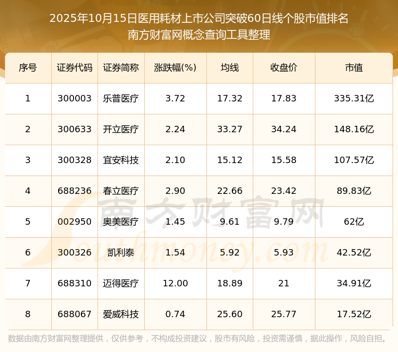 2025年10月15日医用耗材上市公司突破60日线个股市值排名