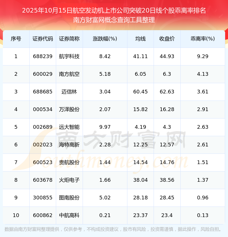 根据南方财富网概念查询工具数据统计,截止2025年10月15日收盘,航空发动机上市公司共有10只个股收盘价向上突破了20日线。其中乖离率较大的个股有航宇科技、南方航空、迈信林等,乖离率分别为9.29%、4.13%、3.61%。