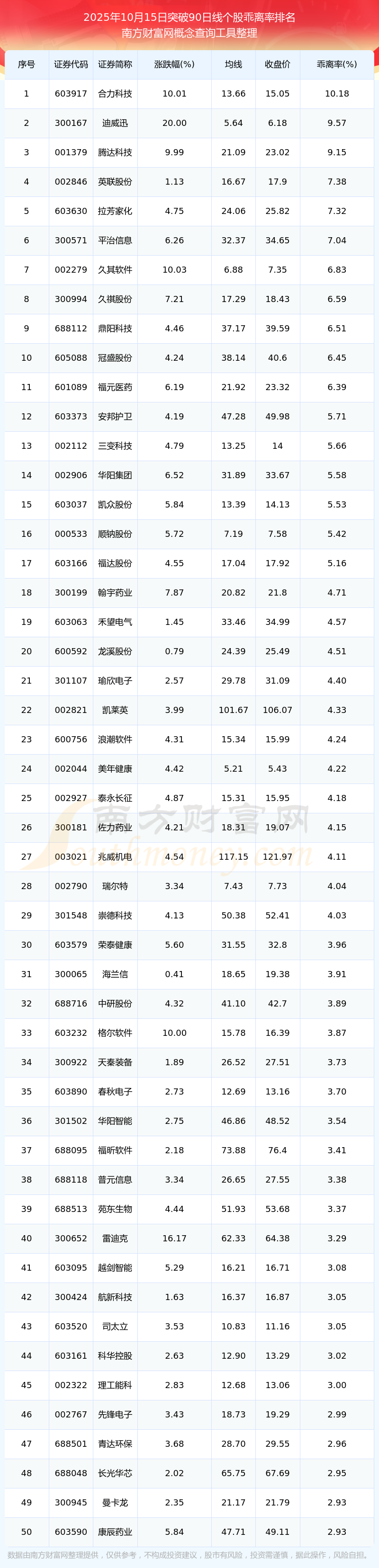 根据南方财富网概念查询工具数据统计,截止2025年10月15日收盘,共有420只个股收盘价向上突破了90日线,其中乖离率较大的个股有合力科技、迪威迅、腾达科技、英联股份、拉芳家化等,乖离率分别为10.18%、9.57%、9.15%、7.38%、7.32%。