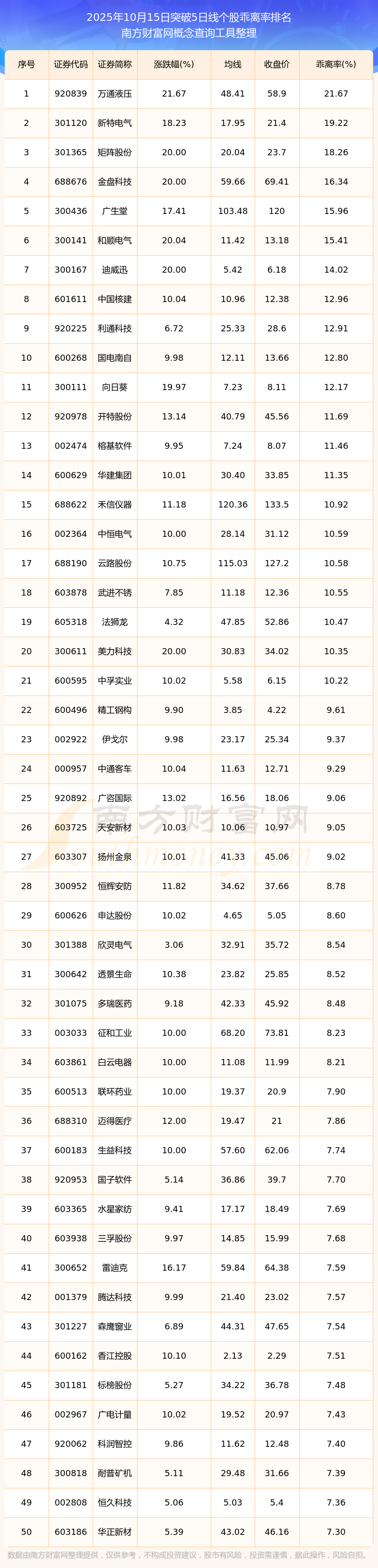 根据南方财富网概念查询工具数据统计,截止2025年10月15日收盘,共有1930只个股收盘价向上突破了5日线,其中乖离率较大的个股有万通液压、新特电气、矩阵股份、金盘科技、广生堂等,乖离率分别为21.67%、19.22%、18.26%、16.34%、15.96%。