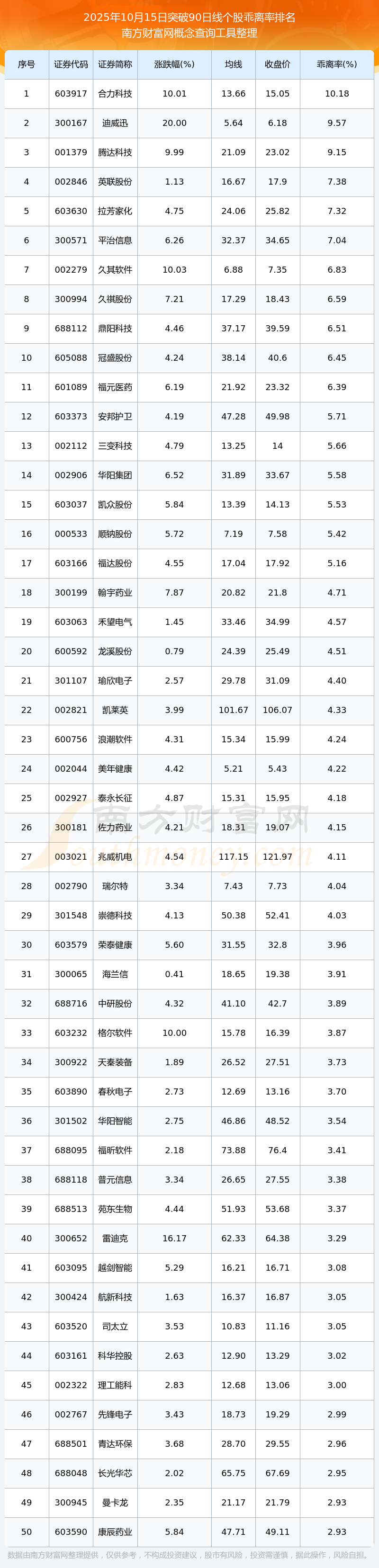 根据南方财富网概念查询工具数据统计,截止2025年10月15日收盘,共有420只个股收盘价向上突破了90日线,其中乖离率较大的个股有合力科技、迪威迅、腾达科技、英联股份、拉芳家化等,乖离率分别为10.18%、9.57%、9.15%、7.38%、7.32%。