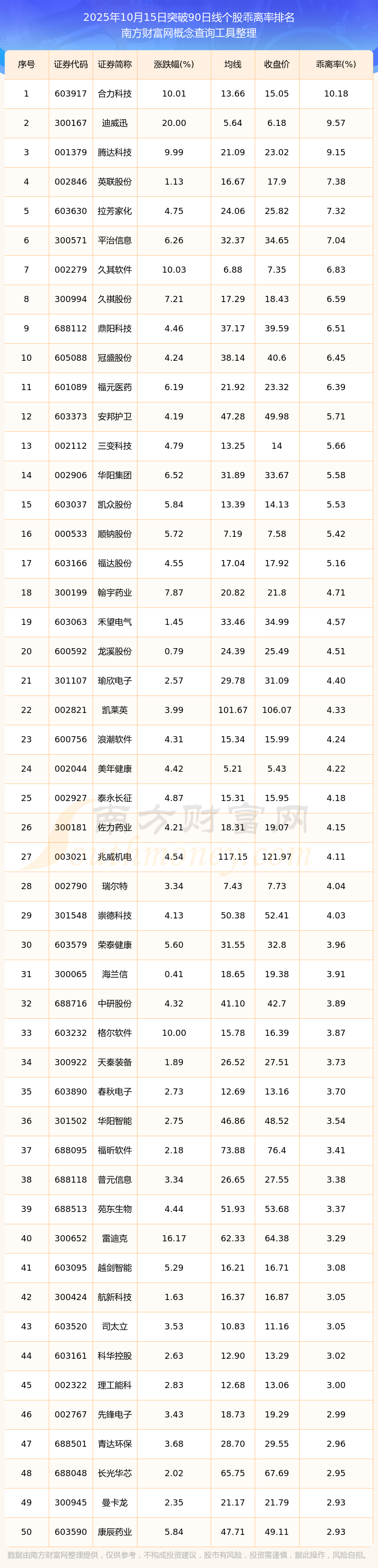 根据南方财富网概念查询工具数据统计,截止2025年10月15日收盘,共有420只个股收盘价向上突破了90日线,其中乖离率较大的个股有合力科技、迪威迅、腾达科技、英联股份、拉芳家化等,乖离率分别为10.18%、9.57%、9.15%、7.38%、7.32%。 2025年10月15日突破90