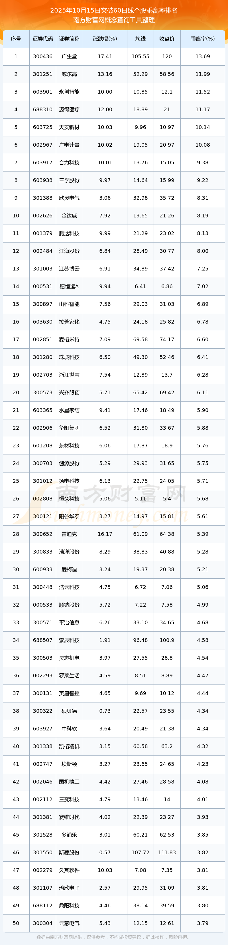 根据南方财富网概念查询工具数据统计,截止2025年10月15日收盘,共有443只个股收盘价向上突破了60日线,其中乖离率较大的个股有广生堂、威尔高、永创智能、迈得医疗、天安新材等,乖离率分别为13.69%、11.99%、11.52%、11.17%、10.14%。
