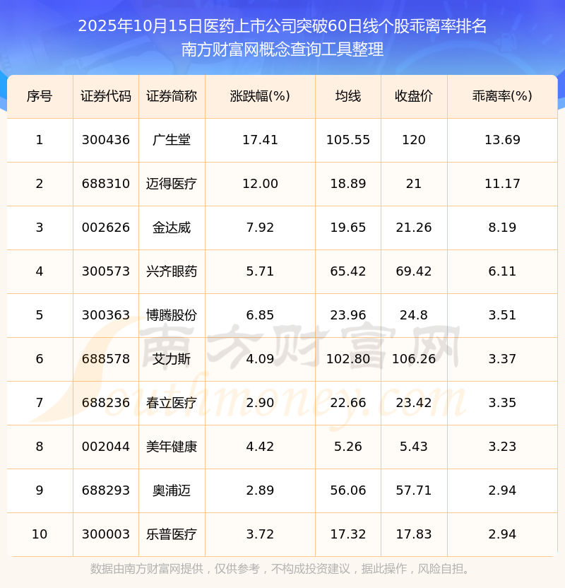 根据南方财富网概念查询工具数据统计,截止2025年10月15日收盘,医药上市公司共有42只个股收盘价向上突破了60日线。其中乖离率较大的个股有广生堂、迈得医疗、金达威等,乖离率分别为13.69%、11.17%、8.19%。