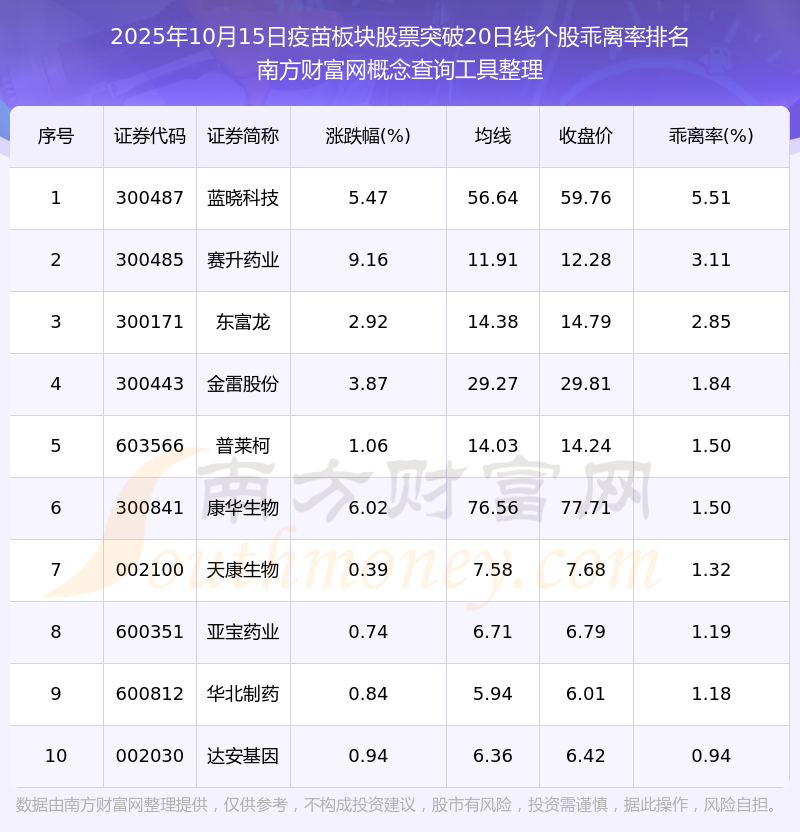 根据南方财富网概念查询工具数据统计,截止2025年10月15日收盘,疫苗板块股票共有20只个股收盘价向上突破了20日线。其中乖离率较大的个股有蓝晓科技、赛升药业、东富龙等,乖离率分别为5.51%、3.11%、2.85%。