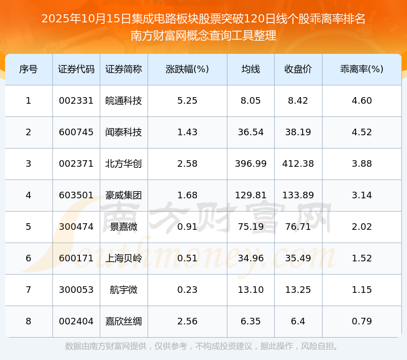 2025年10月15日集成电路板块股票突破120日线个股乖离率排名