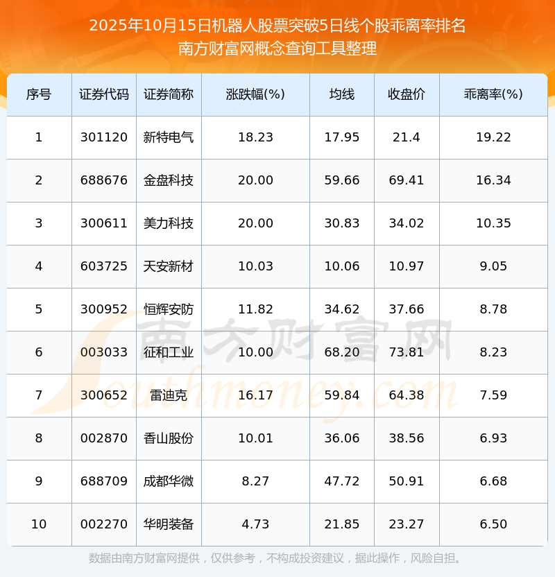 根据南方财富网概念查询工具数据统计,截止2025年10月15日收盘,机器人股票共有213只个股收盘价向上突破了5日线。其中乖离率较大的个股有新特电气、金盘科技、美力科技等,乖离率分别为19.22%、16.34%、10.35%。