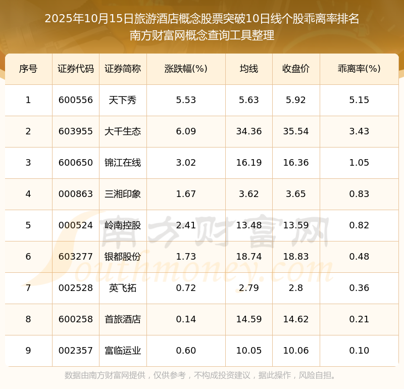 2025年10月15日旅游酒店概念股票突破10日线个股乖离率排名