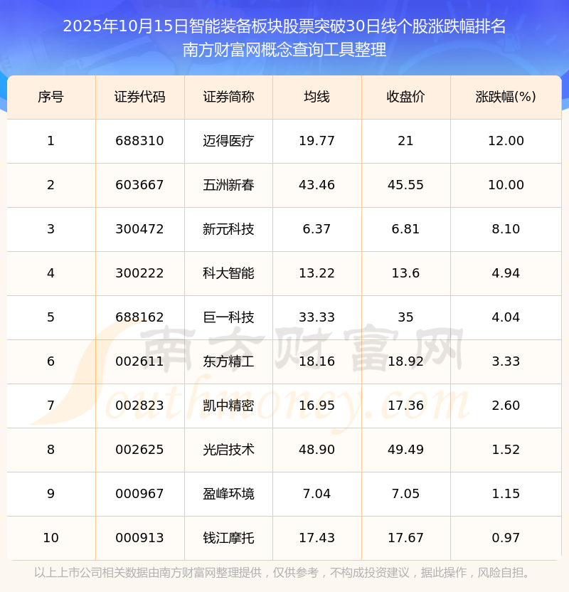根据南方财富网概念查询工具数据统计,截止2025年10月15日收盘,智能装备板块股票共有12只个股收盘价向上突破了30日线。其中涨幅较大的个股有迈得医疗、五洲新春、新元科技等,涨幅分别为12.00%、10.00%、8.10%。