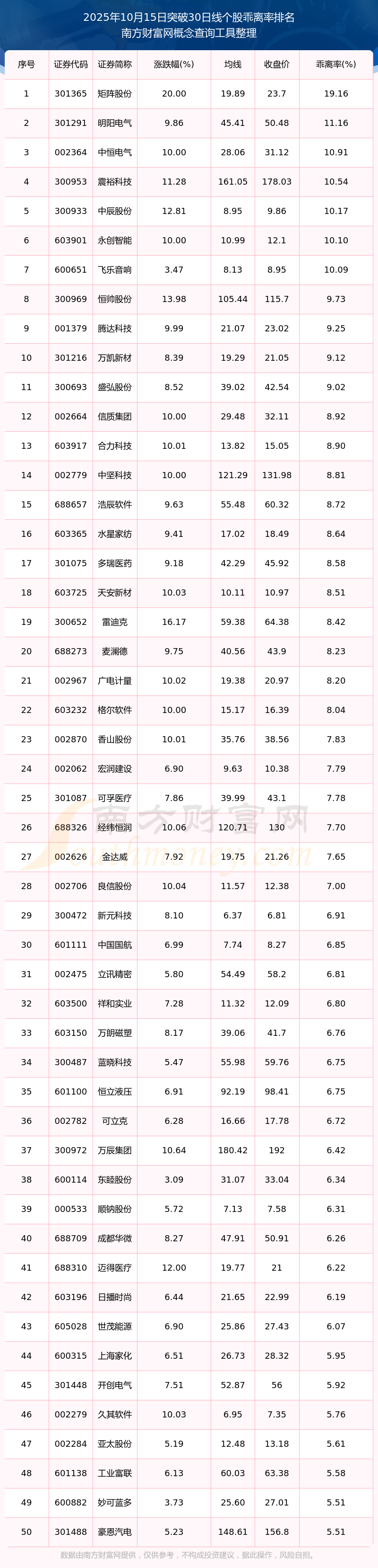 根据南方财富网概念查询工具数据统计,截止2025年10月15日收盘,共有616只个股收盘价向上突破了30日线,其中乖离率较大的个股有矩阵股份、明阳电气、中恒电气、震裕科技、中辰股份等,乖离率分别为19.16%、11.16%、10.91%、10.54%、10.17%。 2025年10月15日