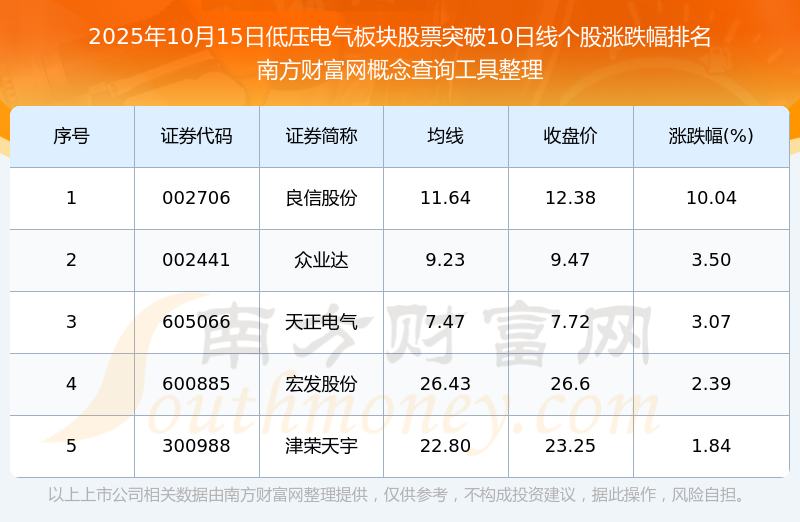 根据南方财富网概念查询工具数据统计,截止2025年10月15日收盘,低压电气板块股票共有5只个股收盘价向上突破了10日线。其中涨幅较大的个股有良信股份、众业达、天正电气等,涨幅分别为10.04%、3.50%、3.07%。