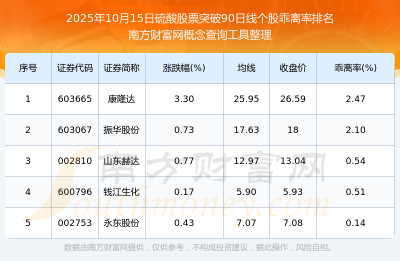 根据南方财富网概念查询工具数据统计,截止2025年10月15日收盘,硫酸股票共有5只个股收盘价向上突破了90日线。其中乖离率较大的个股有康隆达、振华股份、山东赫达等,乖离率分别为2.47%、2.10%、0.54%。