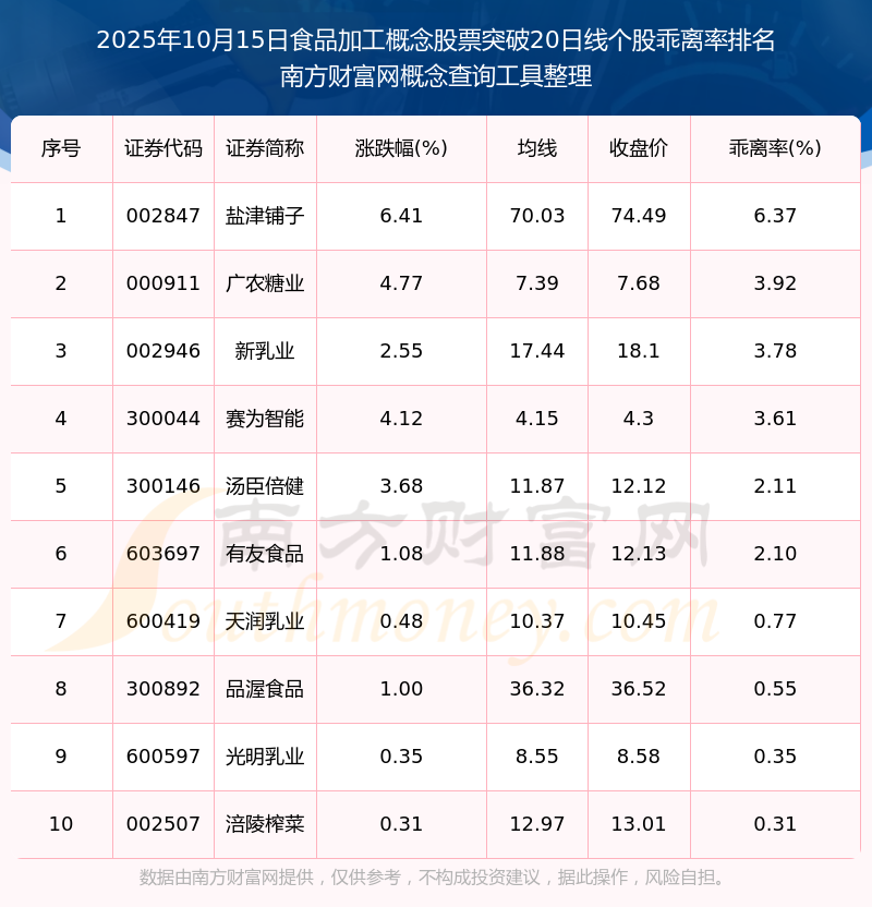 2025年10月15日食品加工概念股票突破20日线个股乖离率排名