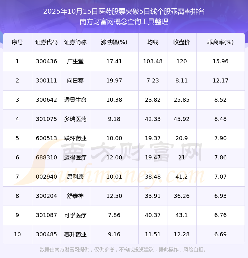 根据南方财富网概念查询工具数据统计,截止2025年10月15日收盘,医药股票共有277只个股收盘价向上突破了5日线。其中乖离率较大的个股有广生堂、向日葵、透景生命等,乖离率分别为15.96%、12.17%、8.52%。