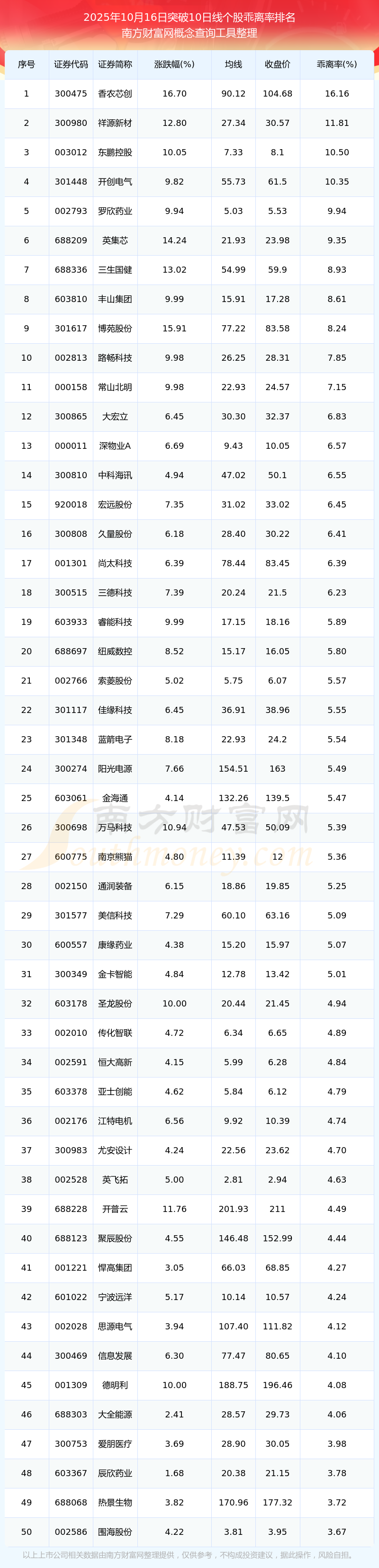 根据南方财富网概念查询工具数据统计,截止2025年10月16日收盘,共有255只个股收盘价向上突破了10日线,其中乖离率较大的个股有香农芯创、祥源新材、东鹏控股、开创电气、罗欣药业等,乖离率分别为16.16%、11.81%、10.50%、10.35%、9.94%。