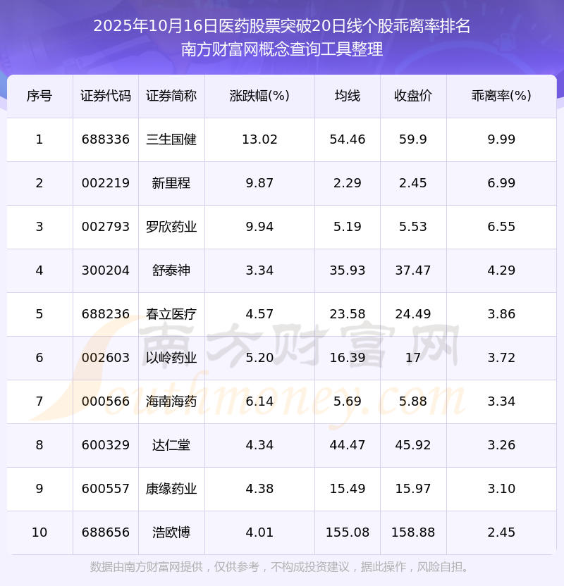 根据南方财富网概念查询工具数据统计,截止2025年10月16日收盘,医药股票共有42只个股收盘价向上突破了20日线。其中乖离率较大的个股有三生国健、新里程、罗欣药业等,乖离率分别为9.99%、6.99%、6.55%。