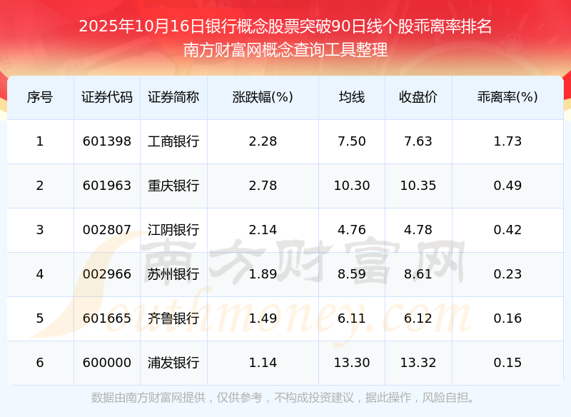 根据南方财富网概念查询工具数据统计,截止2025年10月16日收盘,银行概念股票共有6只个股收盘价向上突破了90日线。其中乖离率较大的个股有工商银行、重庆银行、江阴银行等,乖离率分别为1.73%、0.49%、0.42%。