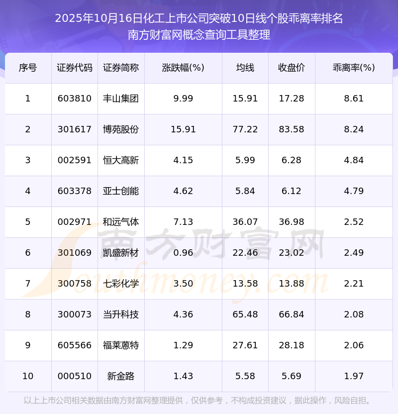 根据南方财富网概念查询工具数据统计,截止2025年10月16日收盘,化工上市公司共有24只个股收盘价向上突破了10日线。其中乖离率较大的个股有丰山集团、博苑股份、恒大高新等,乖离率分别为8.61%、8.24%、4.84%。