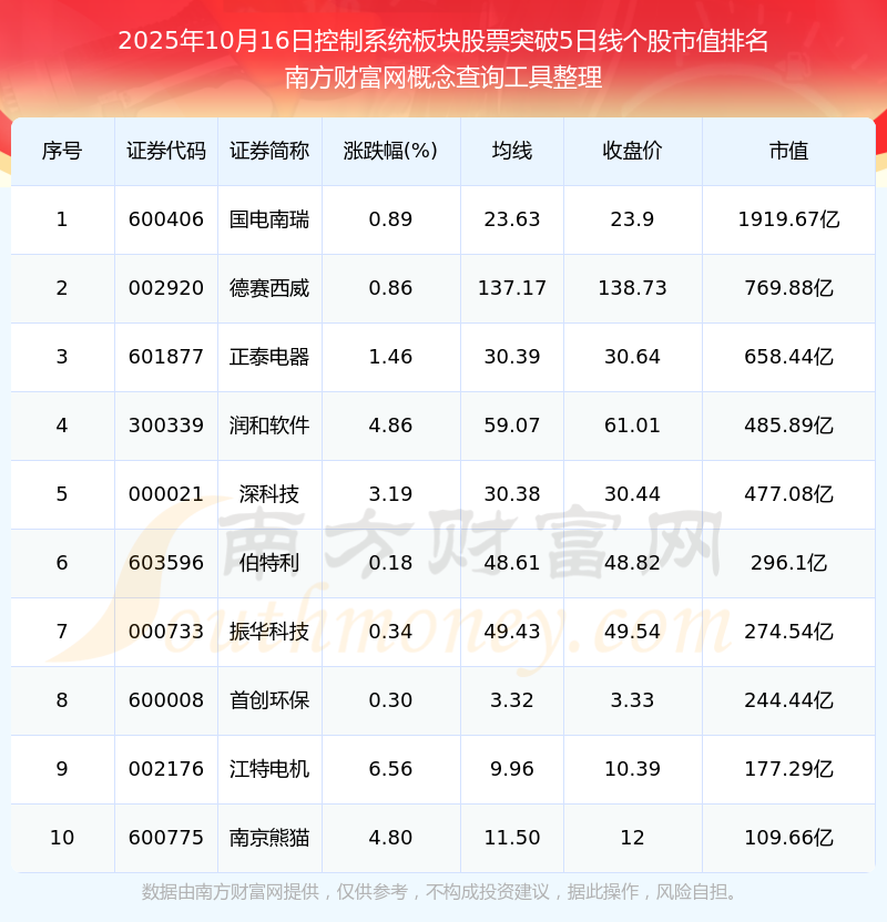 2025年10月16日控制系统板块股票突破5日线个股市值排名