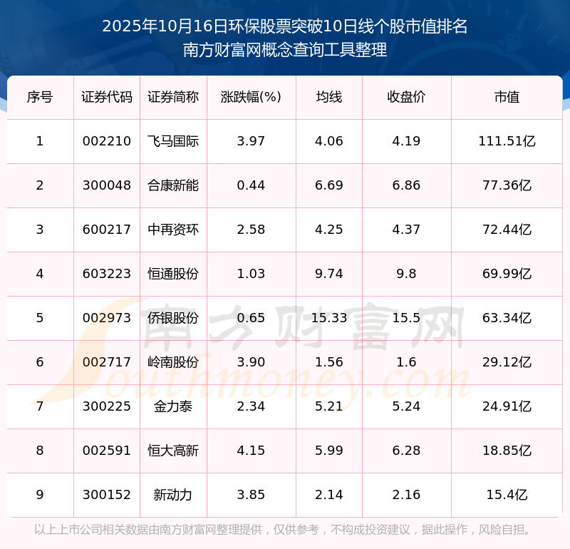 根据南方财富网概念查询工具数据统计,截止2025年10月16日收盘,环保股票共有9只个股收盘价向上突破了10日线。其中市值较大的个股有飞马国际、合康新能、中再资环等,市值分别为111.51亿、77.36亿、72.44亿。