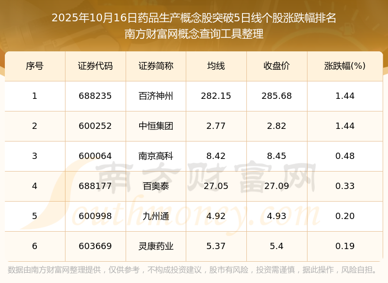 根据南方财富网概念查询工具数据统计,截止2025年10月16日收盘,药品生产概念股共有6只个股收盘价向上突破了5日线。其中涨幅较大的个股有中恒集团、百济神州、南京高科等,涨幅分别为1.44%、1.44%、0.48%。