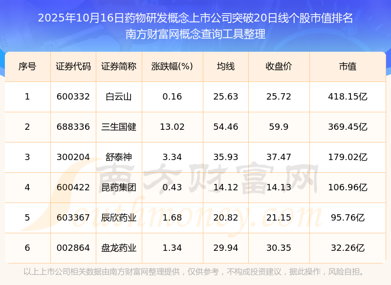 2025年10月16日药物研发概念上市公司突破20日线个股市值排名