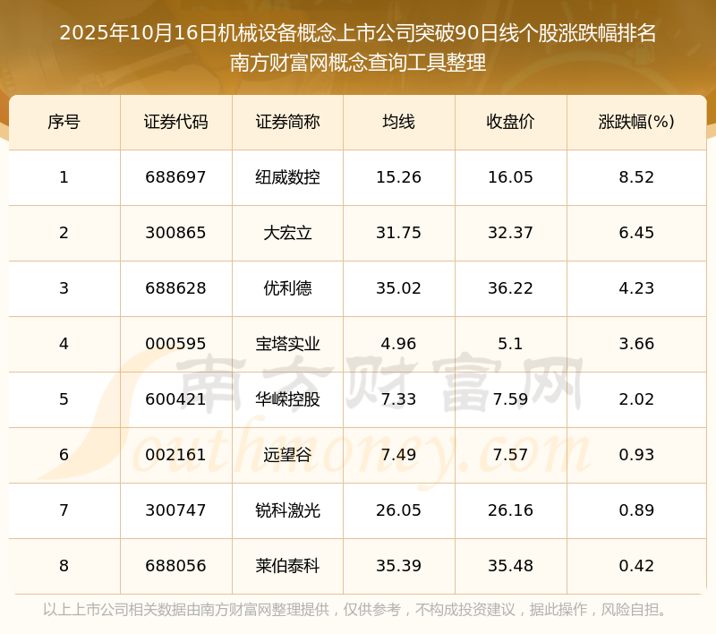 根据南方财富网概念查询工具数据统计,截止2025年10月16日收盘,机械设备概念上市公司共有8只个股收盘价向上突破了90日线。其中涨幅较大的个股有纽威数控、大宏立、优利德等,涨幅分别为8.52%、6.45%、4.23%。