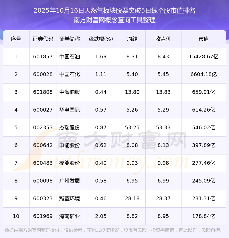 2025年10月16日天然气板块股票突破5日线个股市值排名