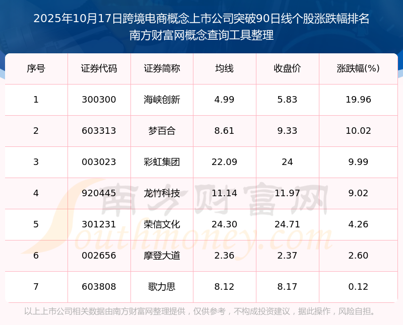 2025年10月17日跨境电商概念上市公司突破90日线个股涨跌幅排名