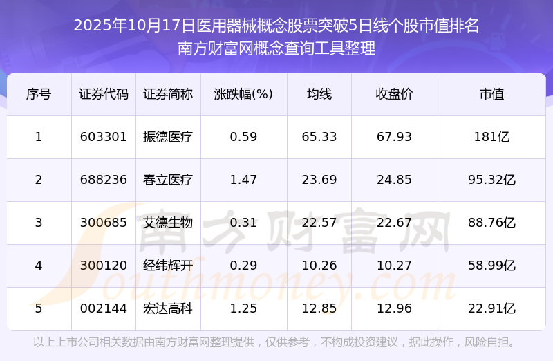2025年10月17日医用器械概念股票突破5日线个股市值排名