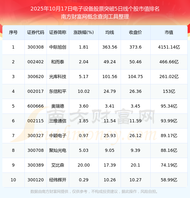 2025年10月17日电子设备股票突破5日线个股市值排名