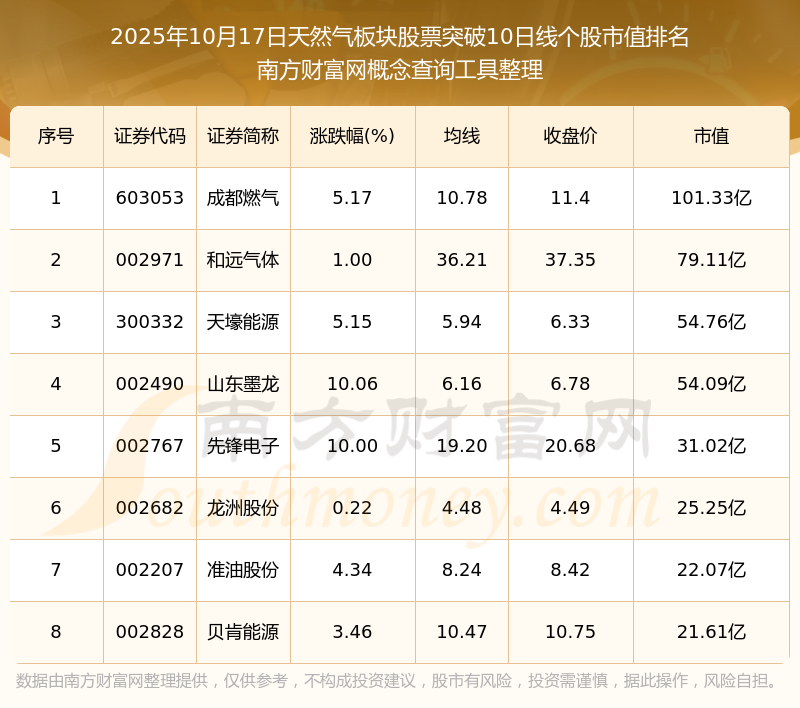 2025年10月17日天然气板块股票突破10日线个股市值排名